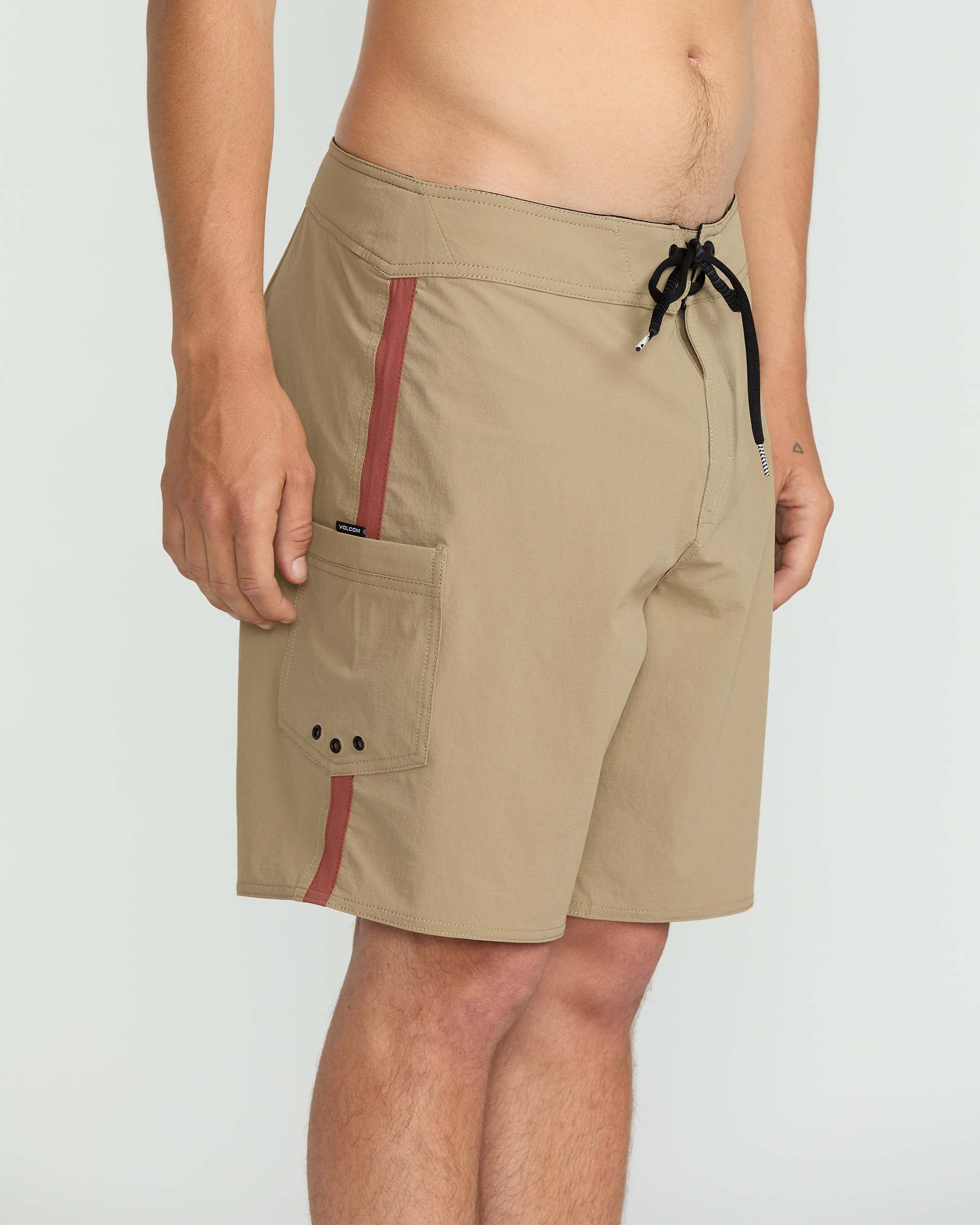 Flexible nylon-stretch blend boardshorts with 18 moveable length. cinch fly. side pocket and signature branding.