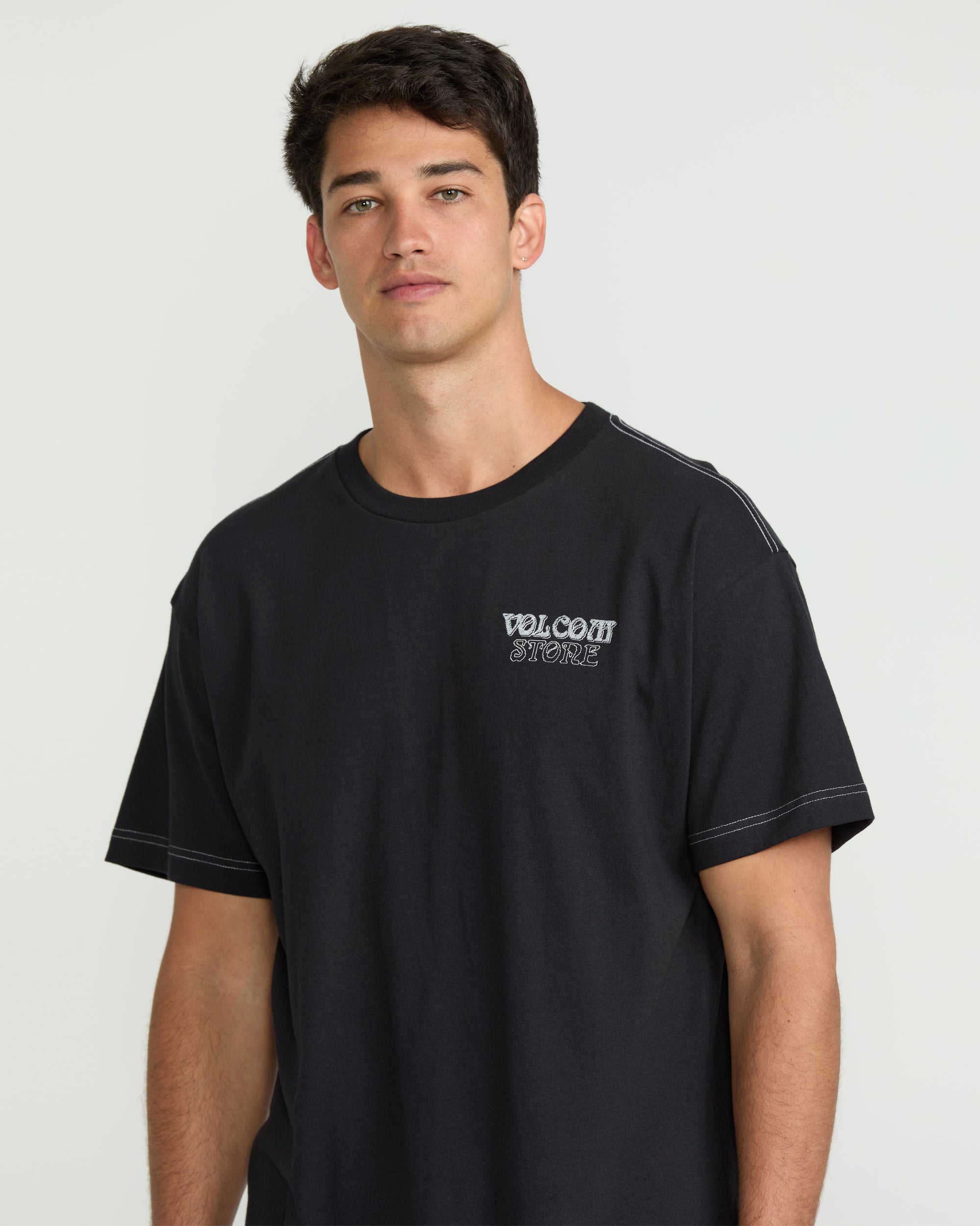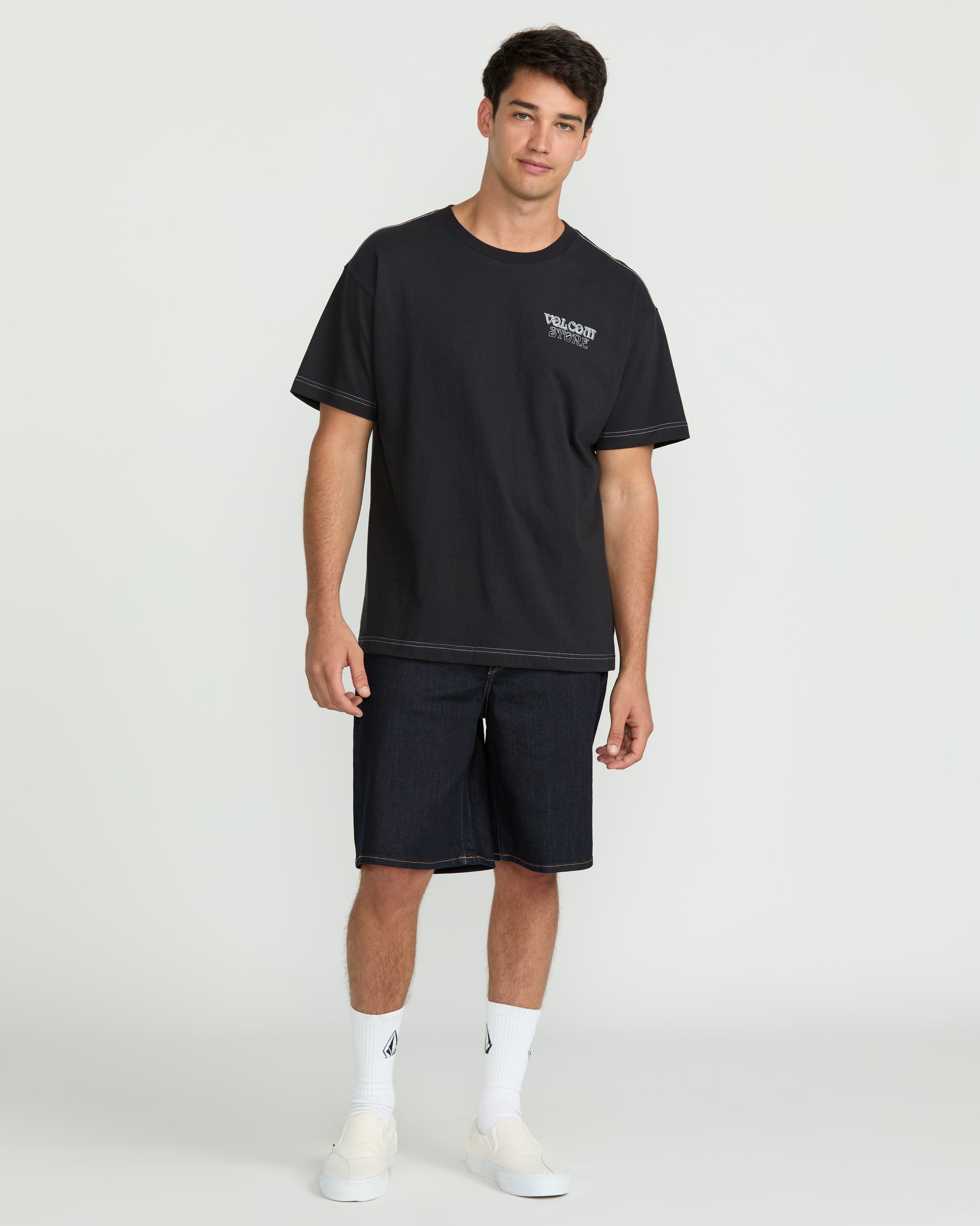 Crafted from a heavy. organic cotton blend. this relaxed-fit Volcom tee exudes a soft. lived-in feel. Stylish accents like contrast stitching. a branded neck tape. and soft screen print graphics add a modern touch.